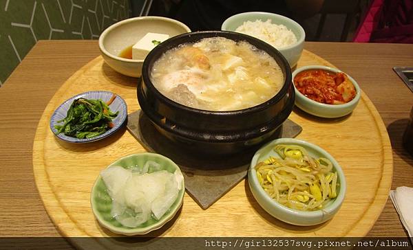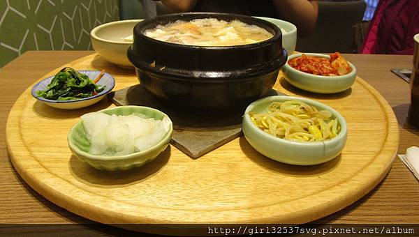 吃完下午茶,剛好跟另一位從宜蘭趕來的友人一起吃晚餐,我們在環球繞上繞下,最後決定去吃韓式料理「韓姜熙的小廚房」,我們三人點的都是「雙饗海陸嫩豆腐煲定食」,除了豆腐煲外,有幾樣小菜和一碗白飯。