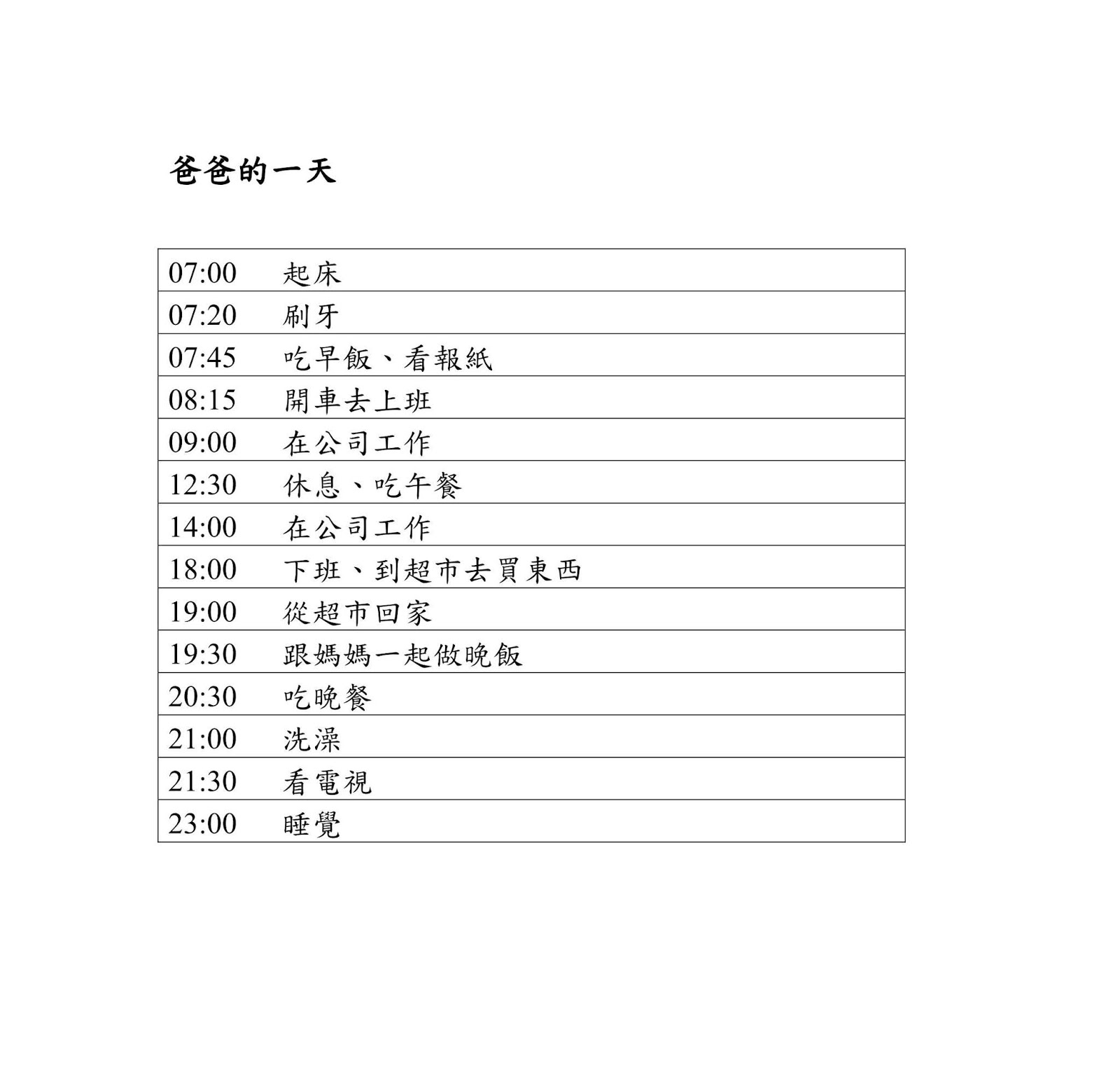 如果是已關注我文章一陣子的老師們,對「一日行程表」這個東西應該不陌生,凡是跟Time When和Time Spent有關的,這份表格就是老師和學生們的好朋友XD 而最近剛好教到「以前」、「以後」和「… 的時候」等文法,所以「一日行程表」就華麗麗地重出江湖啦~
